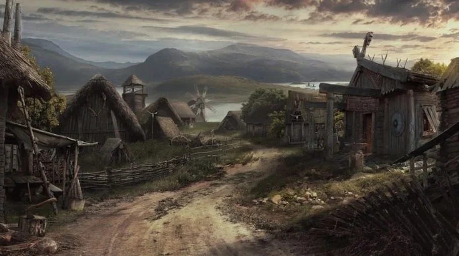 The village came into view as the light bled out of the sky — a cluster of rooftops on a low rise, encircled by a shallow moat where black water mirrored the bruised sunset. A wooden bridge led toward the gatehouse. Beyond it, the silhouette of the keep rose on its separate island like a crouched beast, its single tower marked by that strange, faint glow locals had whispered about: the Nightstone itself, set in its courtyard, forever humming a note too low to quite hear.