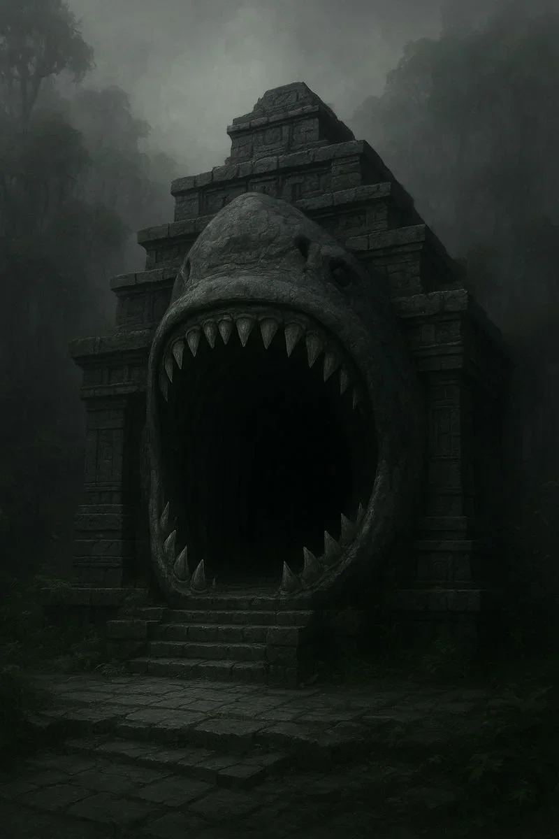 The three friends ran pulling and pushing one another encouraging each other to run as quickly as they could, and not look back. Looking forward, they saw the tunnel’s mouth, the great gaping jaws of the shark were beginning to close. They left over debris, past traps that they triggered as they ran, and Seventh fell, tripping on a broken piece of statuary. Scooping up her smaller friend Topaz ran carrying him her legs aching with the effort. Just as the opening began to vanish the three friends threw themselves past the jagged teeth as they slammed closed.