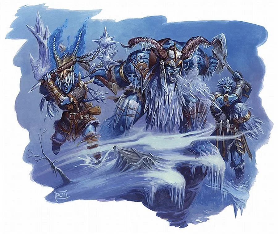 We were breaking camp when the frost shifted—subtle at first, then violent. Two massive shapes tore their way out of the frozen earth, towering over us in a storm of ice and bad decisions. Giants. Or something close enough that arguing about it wouldn’t help.
